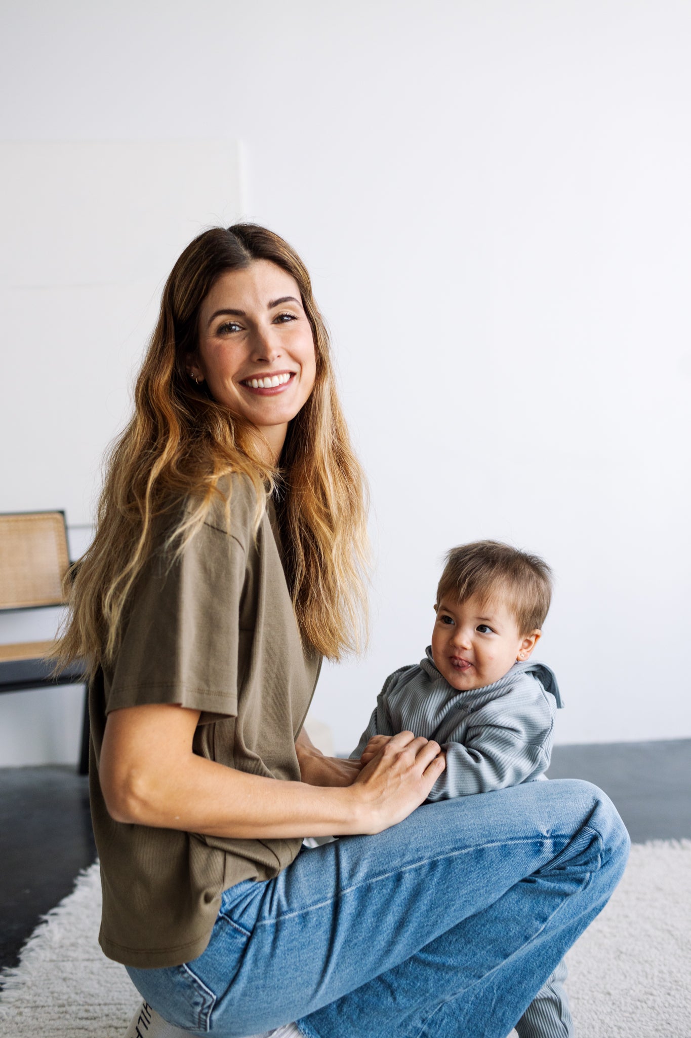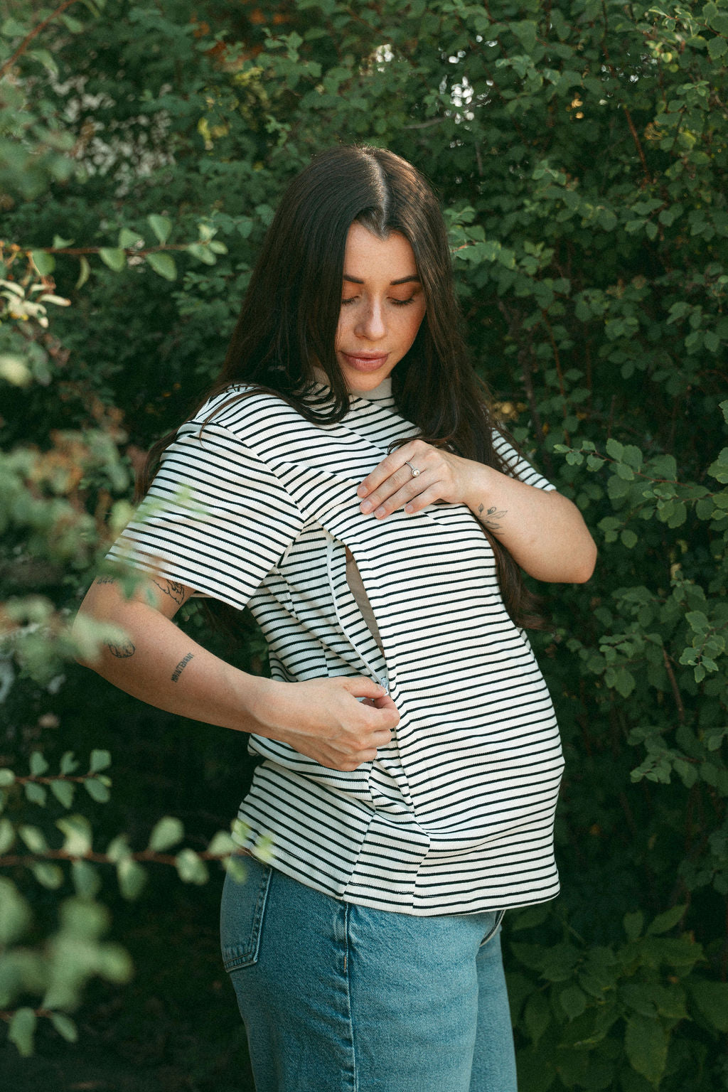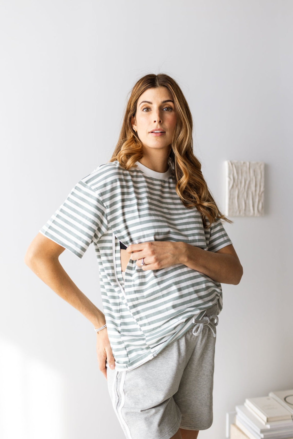 Crewneck d'allaitement rayé vert avec bordures bleues