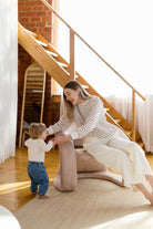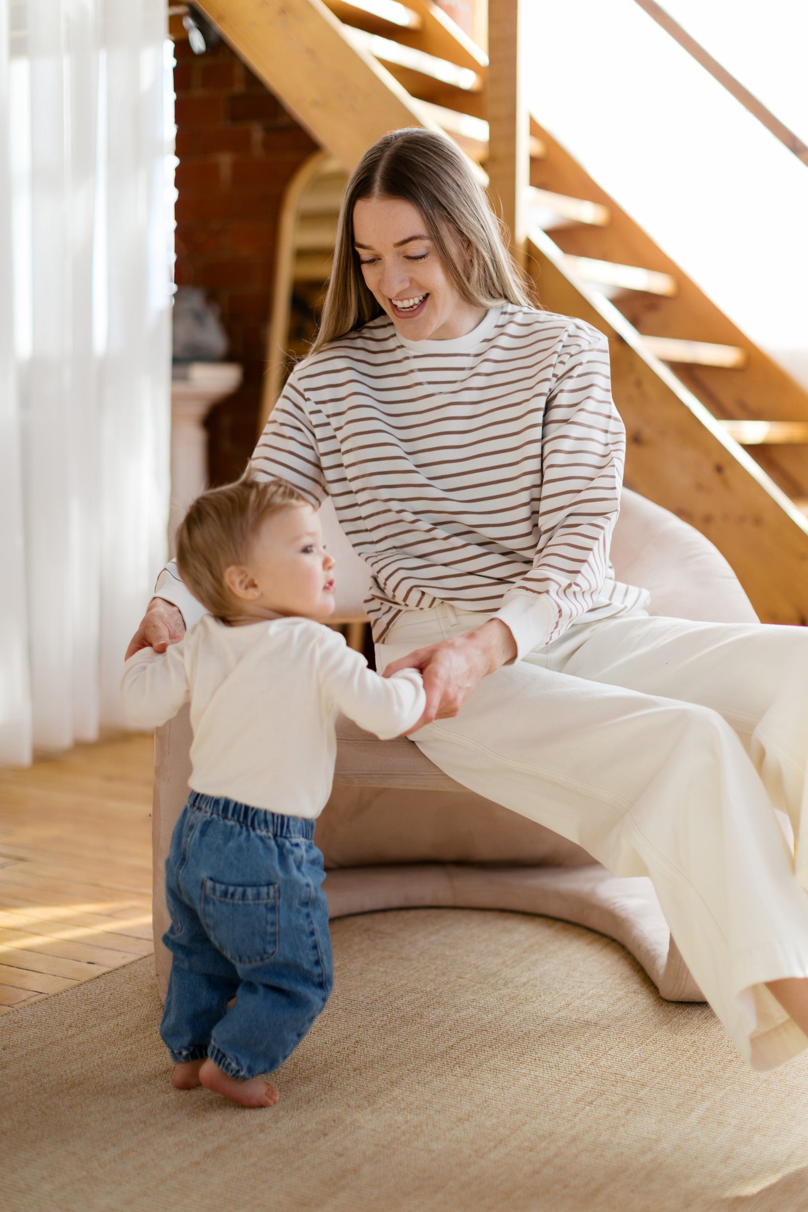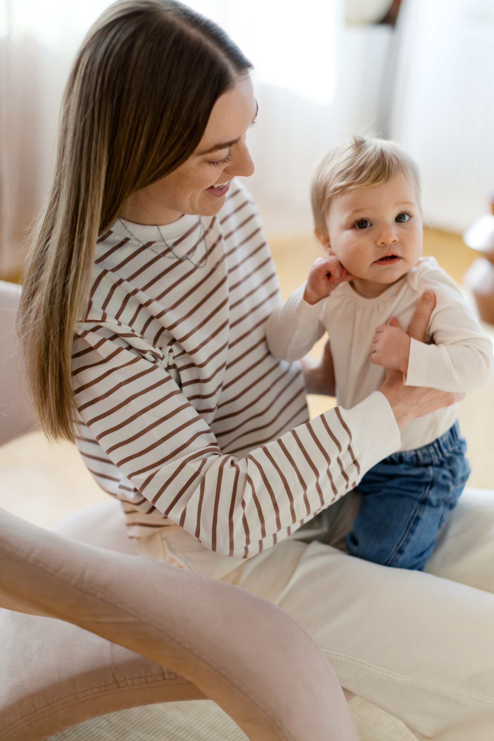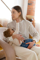 Ce crewneck ivoire à rayures beiges, fait de coton biologique, est pensé pour t’accompagner dans toutes les phases de la maternité — avec douceur et style.