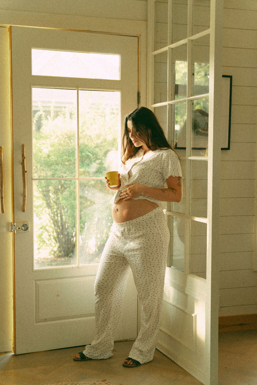 Le haut à petits boutons pratiques rend l’allaitement simple, même à moitié endormie, tandis que le pantalon fluide et léger t’offre un confort absolu avant, pendant et après la maternité.
